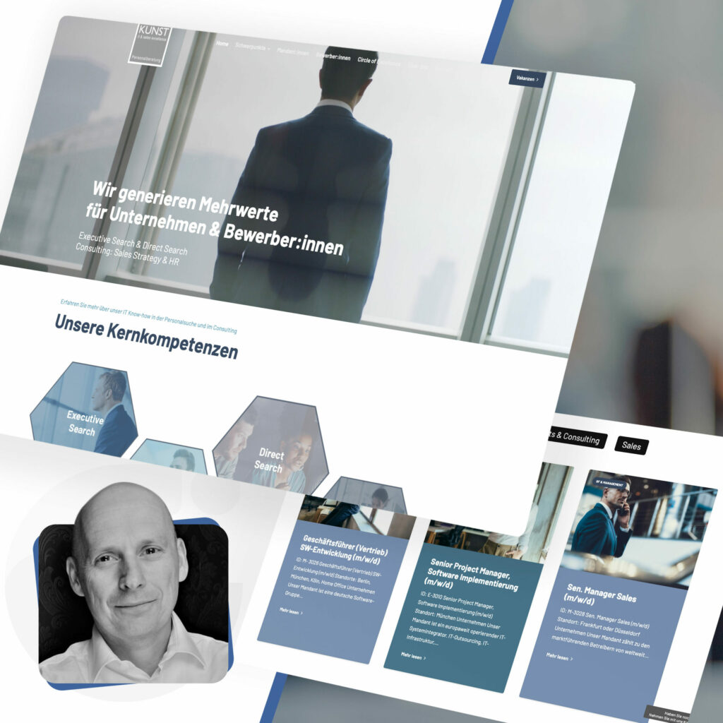 KUNST Personalberatung unterstützt Unternehmen bei der Personalsuche von IT Managern, IT Experts und Sales Managern. Unsere Aufgabe war es, eine neue digitale Designsprache für das Unternehmen zu entwickeln, welche ihren Website Auftritt deutlich von Wettbewerbern abhebt.